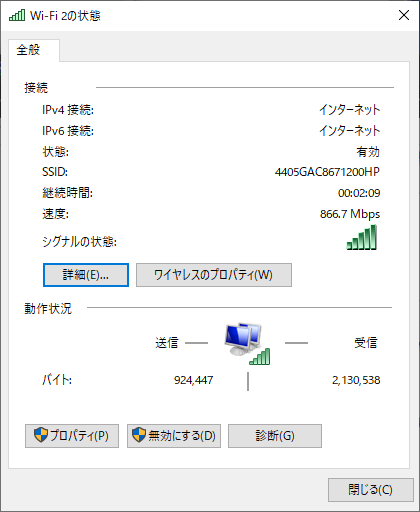 まだWiFiのアクセスポイントが802.11acのデュアルチャンネル、867Mbpsのままなので、速度の恩恵はありませんが、ThinkPad E495は汎用のWi-Fi 6対応のIntel AX200 802.11axを認識し、問題なく通信できることを確認しました。